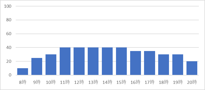 また、時間帯別では、お昼時が一番混雑する時間帯となりますが、それでも日曜日のピークの半分くらいの混雑です。