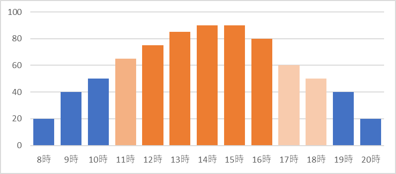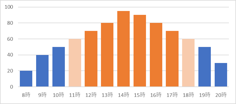 時間帯別では、お昼前後から夕方まで混雑が続きます。